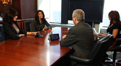 participants in the deposition are sitting in a conference room, but court